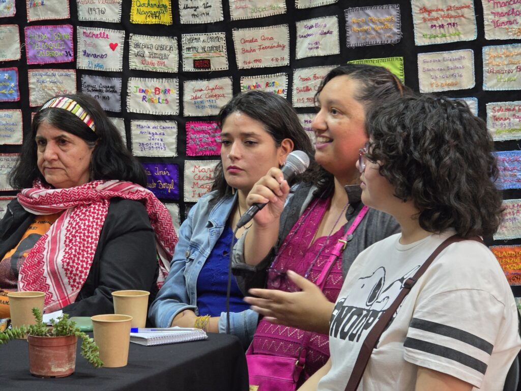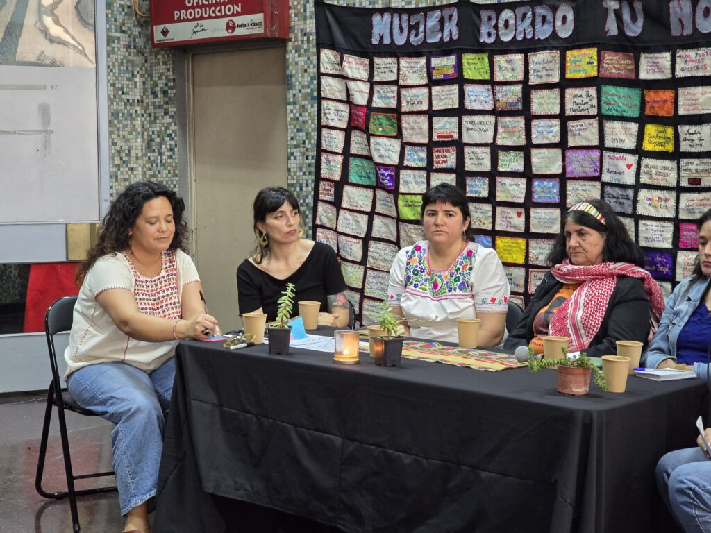 El encuentro finalizó con el conversatorio Mujeres: arte, memoria y resistencia, un espacio en el que dialogaron y reflexionaron Catalina Salas (monitora del taller de arpillera), Romina Carrasco (monitora del taller de telar mapuche), Carmen Gloria Marchant y Carolina Pinilla (colectivo de arpilleristas Feminismo Comunitario de Abya Yala Tejido Chile, de Lo Hermida); Eugenia Calquín y grupo de bordadoras de Padre Hurtado, quienes presentaron un mapeo textil colectivo en proceso. La coordinadora del Sitio de Memoria Estadio Victor Jara, Mariela Llancaqueo moderó el conversatorio que buscaba fortalecer vínculos comunitarios e institucionales en torno a prácticas culturales con perspectiva de género y derechos humanos.