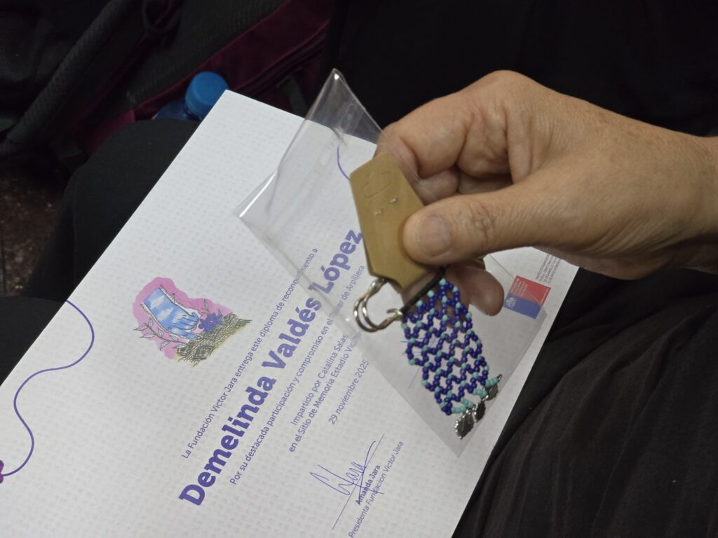 La estudiante del taller de telar mapuche, Natalia Justiniano Pereira, comentó su gratitud por haber sido parte de este curso. «Siento un orgullo muy grande de haber participado, de haber logrado llegar hasta el final con mis trabajos, y de estar en este lugar (sitio de memoria) creando y entregando amor, creatividad, paciencia. Doy las gracias a este espacio de memoria».