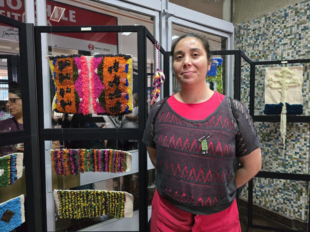 Natalia Justiniano Pereira junto a su trabajo del tercer ciclo del taller de telar mapuche