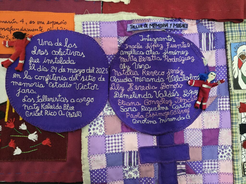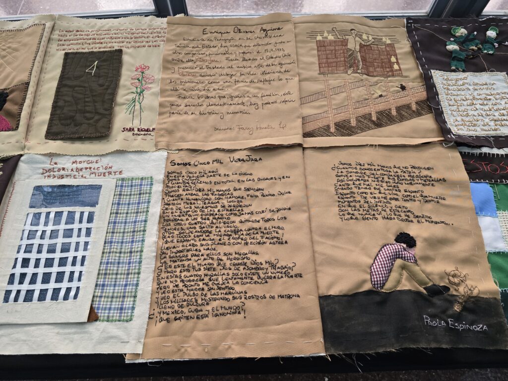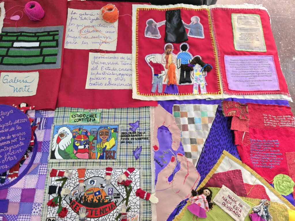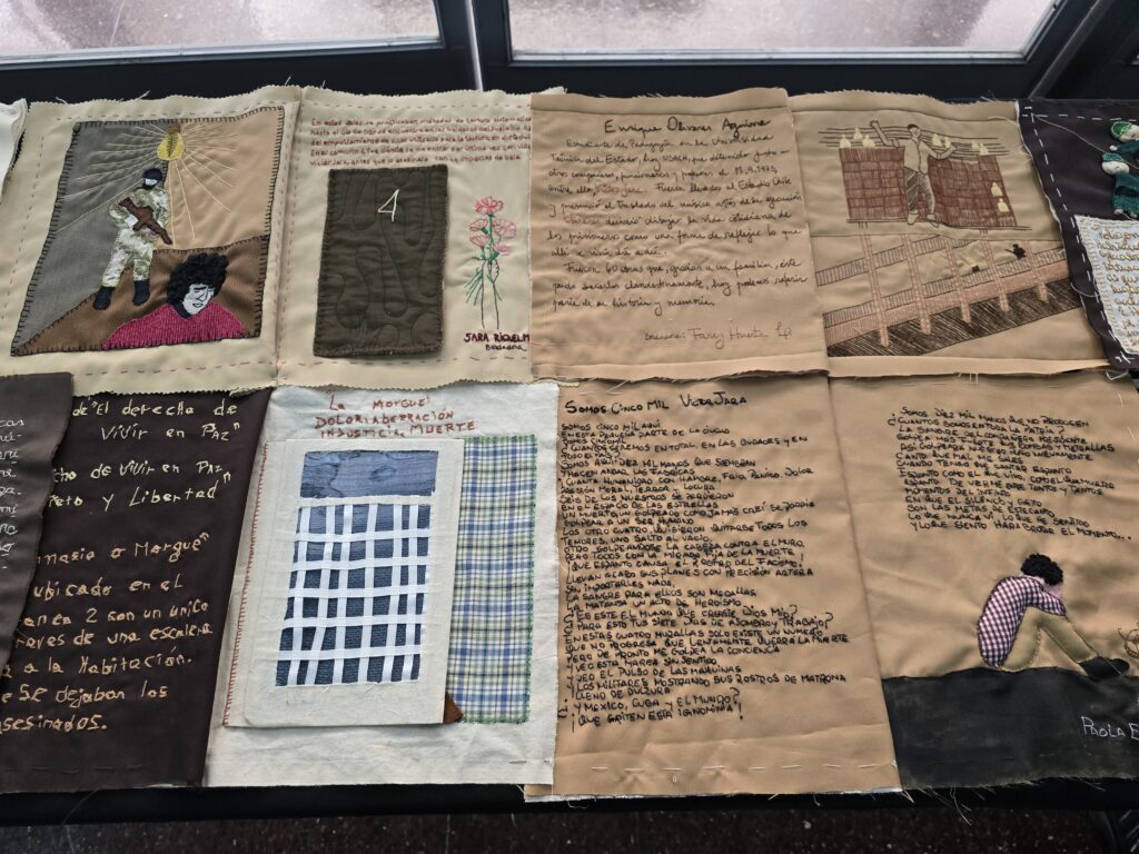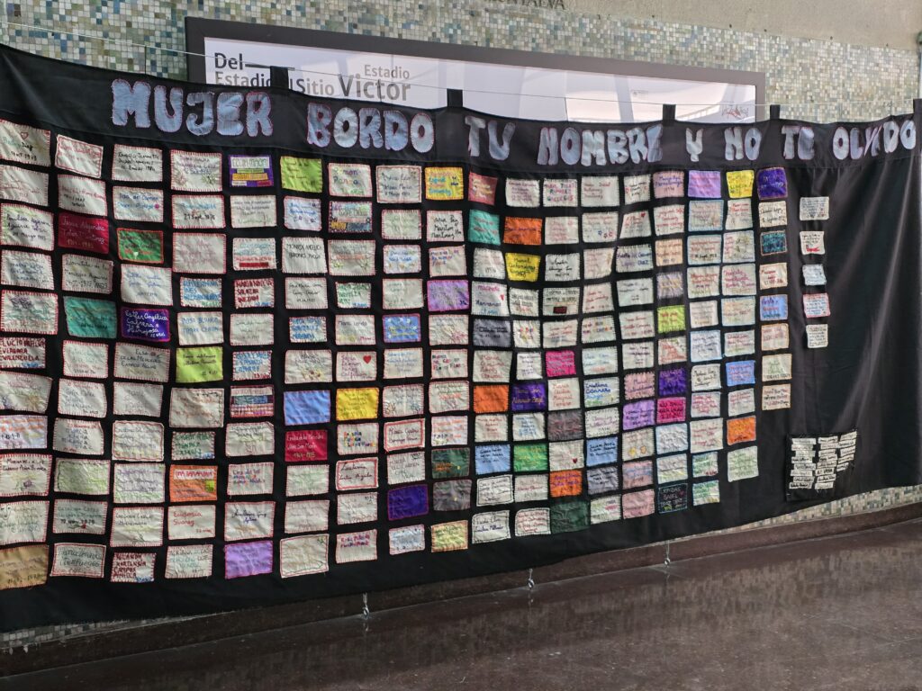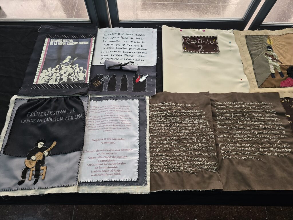 Un libro bordado con arpilleras que narra la historia del ex Estadio Chile —actual Sitio de Memoria Estadio Victor Jara—, una muestra con la técnica del chañuntuko del telar mapuche que representa al río Mapocho y un lienzo bordado que rinde homenaje a mujeres y niñas ejecutadas y desaparecidas en dictadura y democracia fueron parte de la exposición final de los talleres textiles gratuitos de la Fundación Victor Jara.