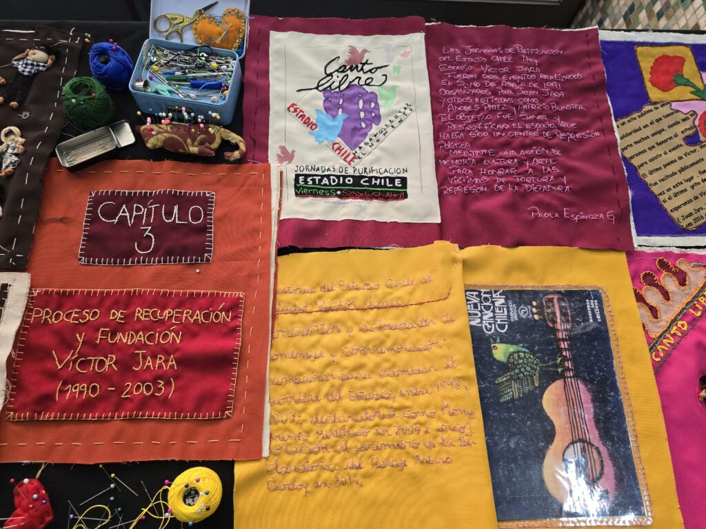 Fotografías de algunos de los capítulos del libro bordado que narra la historia del Sitio de Memoria Estadio Victor Jara