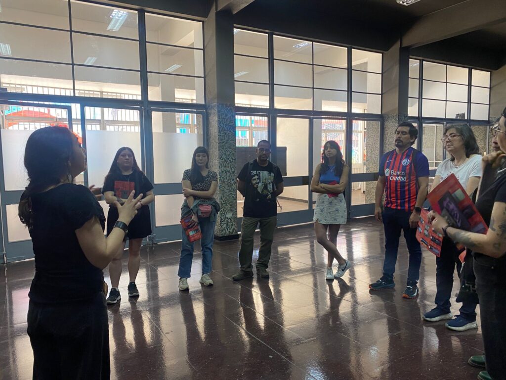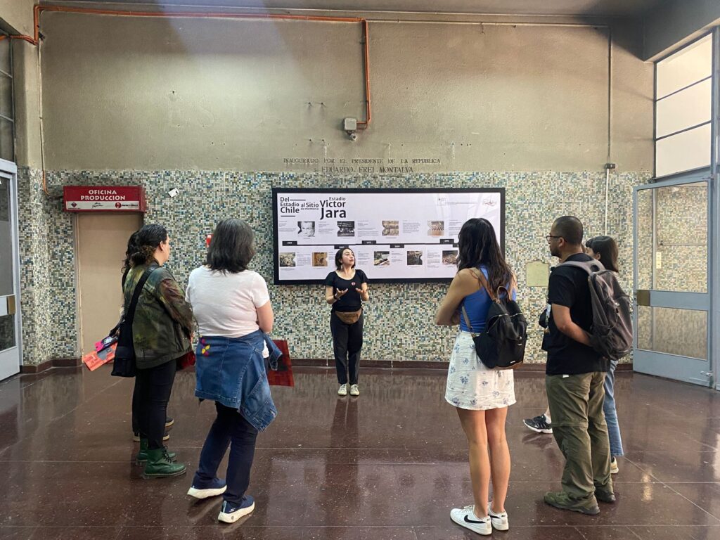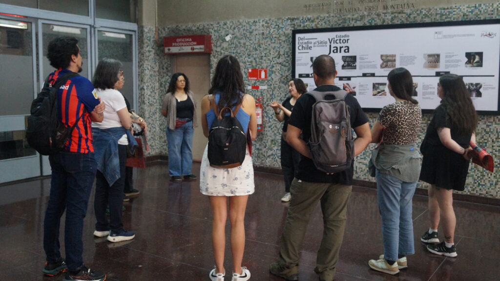 En el marco de la conmemoración del Día del Profesor y de la Profesora, el pasado sábado 18 de octubre la Fundación Victor Jara realizó un encuentro con docentes en el Sitio de Memoria Estadio Victor Jara, el que además contempló un recorrido guiado por el espacio. A través de la visita, la encargada de educación, Ana González, contó la historia del ex Estadio Chile, detallando sus capas de memorias hasta su presente.