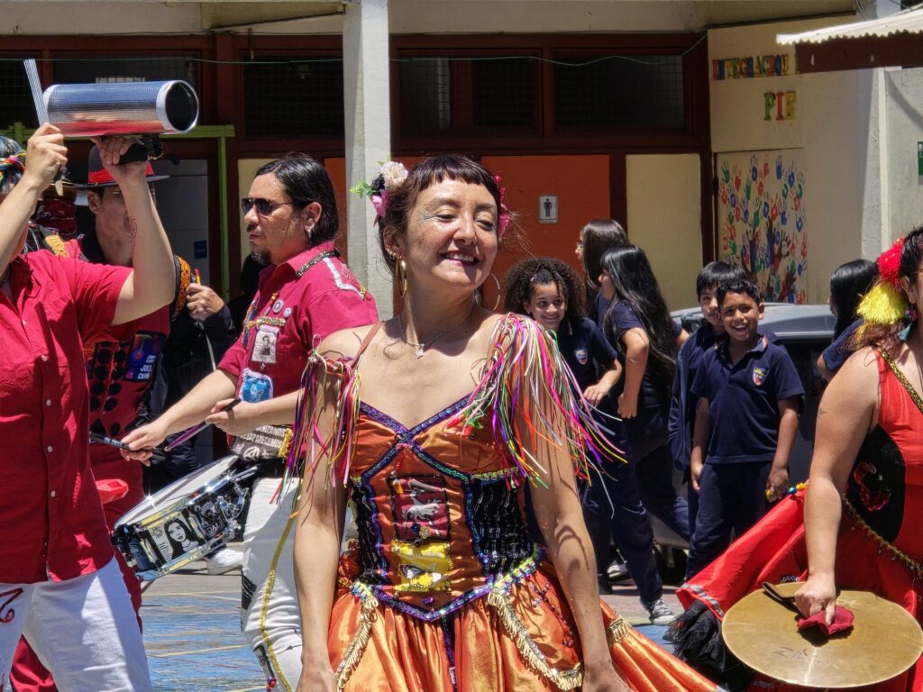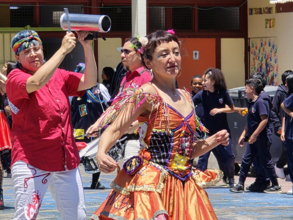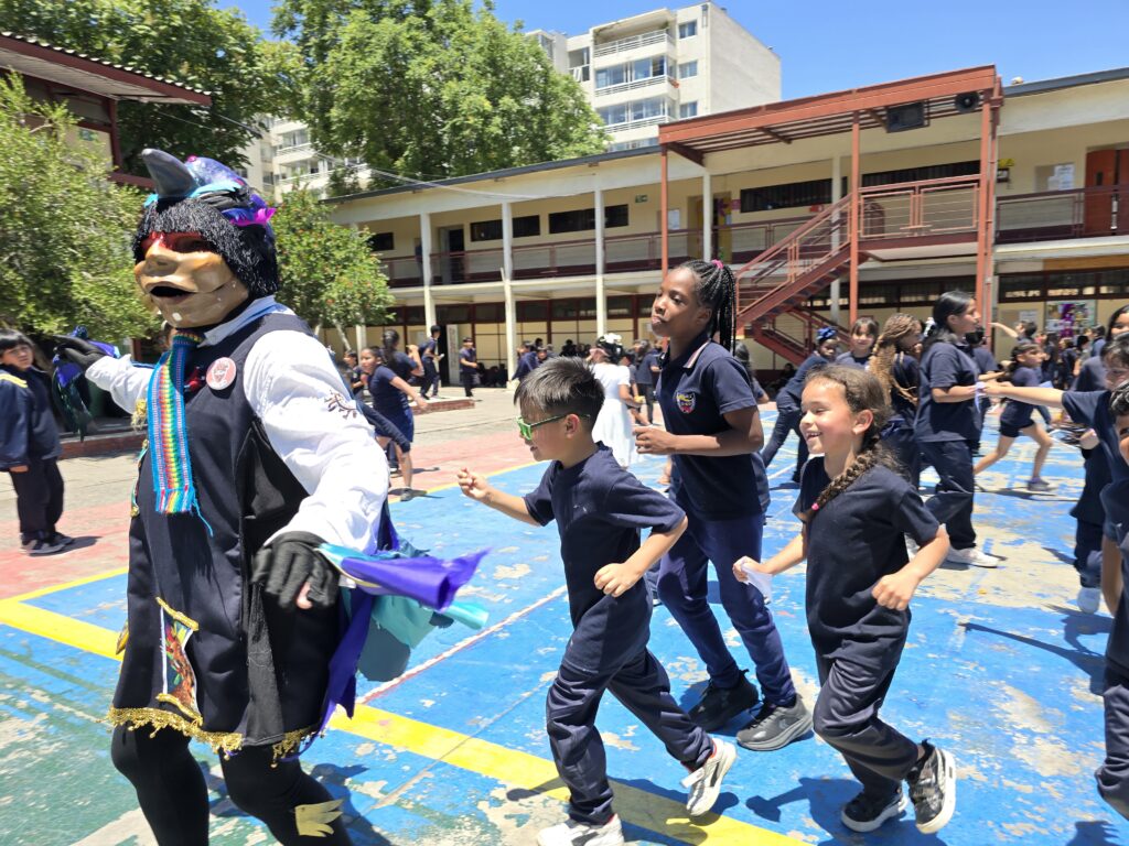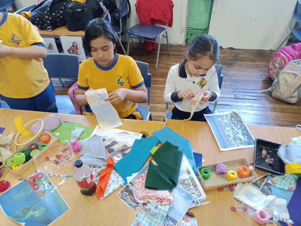 «En el caso de la Escuela República de Ecuador, desde el establecimiento nos contaron que tenían el interés que las niñas aprendieran la técnica del bordado, a raíz de eso nos contactaron ya que sabían que como Fundación Victor Jara realizábamos talleres de arpilleras. Por último, para el caso de la Escuela República de Colombia, escogimos la intervención de la Chinchintirapié para dar una continuidad y fortalecer el trabajo que hemos hecho en conjunto desde las Colonias y los Talleres «Girasol», además, porque en esta escuela hay una alta población migrante, entonces quisimos rescatar y reivindicar las raíces latinoamericanas y la diversidad cultural de nuestro país. La Chinchintirapié representa muy bien estas temáticas, porque recogen distintos ritmos en sus presentaciones», sostuvo.