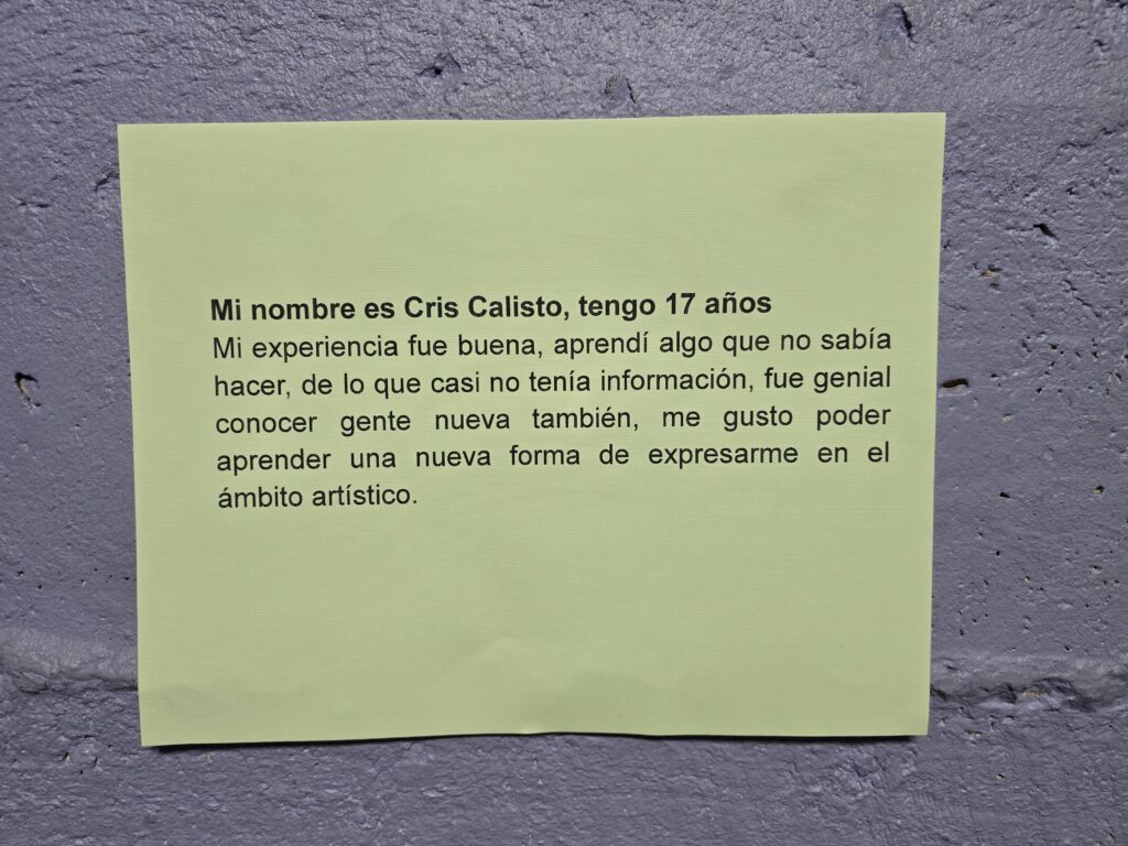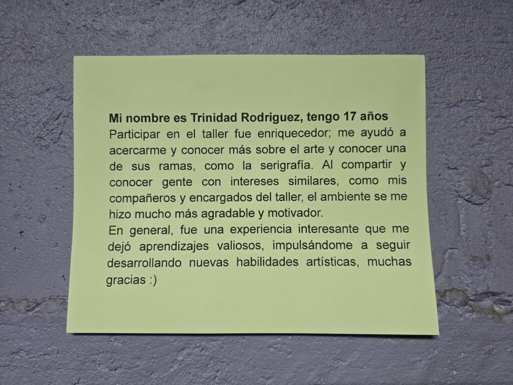 De acuerdo a Ignacio Salazar (17) el taller de serigrafía «fue una experiencia súper bonita, el recuperar sitios de memorias como este, y sobre todo en pos del arte, es algo súper valorable y que no se ve mucho. Además, una disciplina como la serigrafía es súper cara, y el ofrecerla de manera gratuita, la hace democrática y accesible». Su compañera, Emilia Santana (17) comentó que «desde un inicio me gustó mucho, porque siempre me interesó el dibujo, la pintura y los grabados. No había tenido la oportunidad de poder explayarme en eso y esto fue la oportunidad perfecta. Agradezco demasiado la instancia, porque conocí gente muy interesante, compañeros que se desempeñan en otros oficios, que pintan y dibujan».