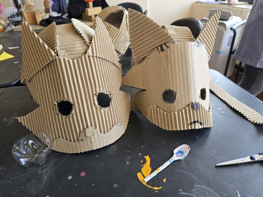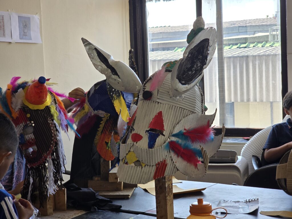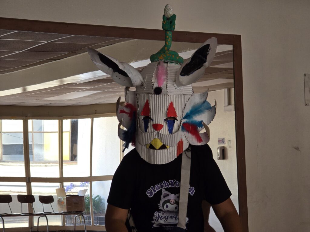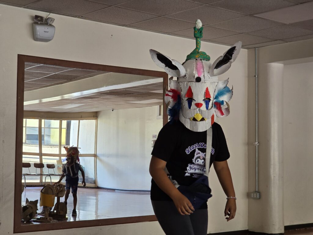 En la foto está David, niño participante del taller de creación de máscaras